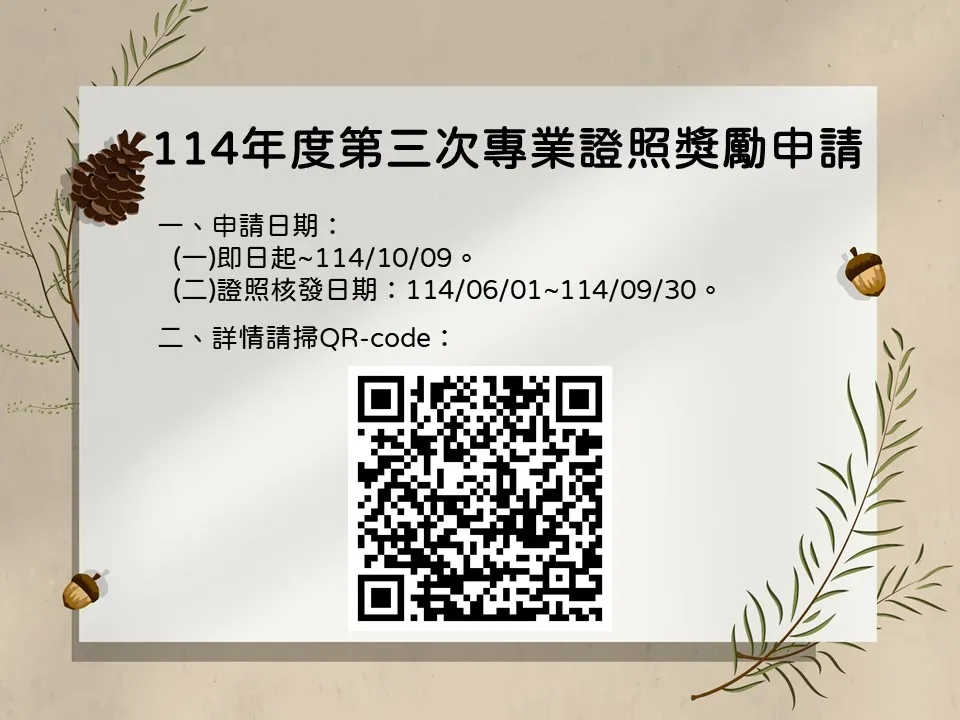 依據「義守大學學生取得專業證照獎勵實施辦法」辦理。一、學生申請日期: (一)即日起~114/10/09。 (二)申請之證照核發日期:114/06/01~114/09/30。二、本次採線上申請,請於期限內完成申請程序,逾時不予以補繳,亦不予以補繳上期之申請。三、線上申請網址如下:https://forms.gle/WYLnWG97eKkTQfGi7。四、相關實施辦法及專業證照獎勵附表各學院分級清單下載途徑如下:學生事務處→安心就學與獎助→校內獎助學金→課外/專業優異專區→學生取得專業證照獎勵金。
